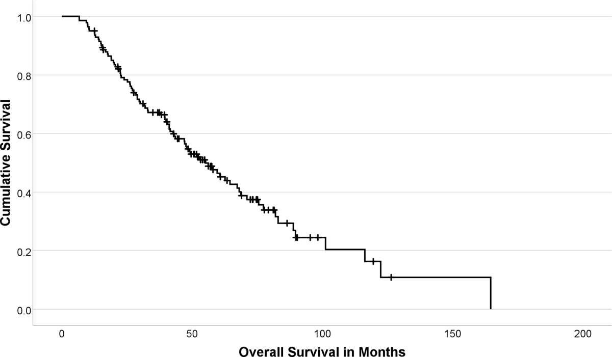 - 整體隊列 (n=141) 的中位 OS 為 55.2 個月 (IQR: 27.1–89.7 個月)。子群組 OS:SI-NET G1-G2:62.7 個月;P-NET G1-G2:41.2 個月;NET G3:26.3 個月。
