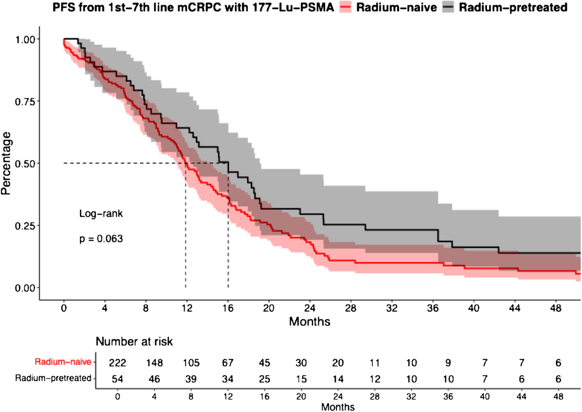 - PFS 分析顯示無顯著差異:Radium-223 預處理組的中位 PFS 為 16.0 個月,而 Radium-223 未處理組為 11.9 個月 (Hazard Ratio [HR]: 0.73, 95% Confidence Interval [CI]: 0.52–1.02, p=0.063)。