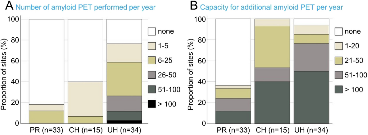- Amyloid PET 的使用相對普遍,尤其是在大學醫院 (university hospitals, UH),但目前整體掃描數量仍然偏低(受訪機構每年約 800 次掃描)。