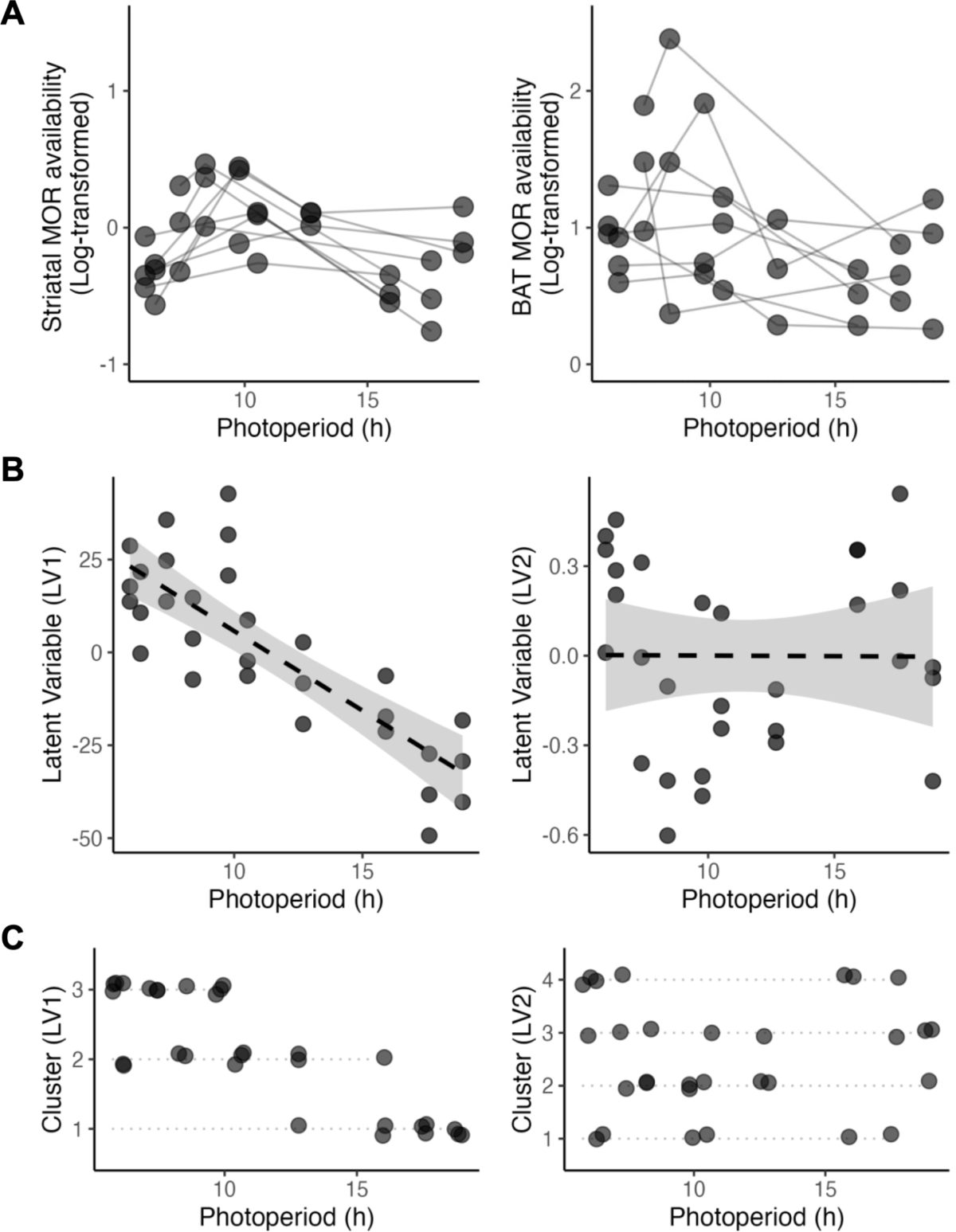- 回歸分析顯示,潛在變數 1(LV1,代表腦部-BAT MOR 連結)與光週期之間存在顯著的負向線性關係(beta = -4.32, 95% CI [-5.30, -3.35], p < 0.001),表示在日照較短時預測性更強。