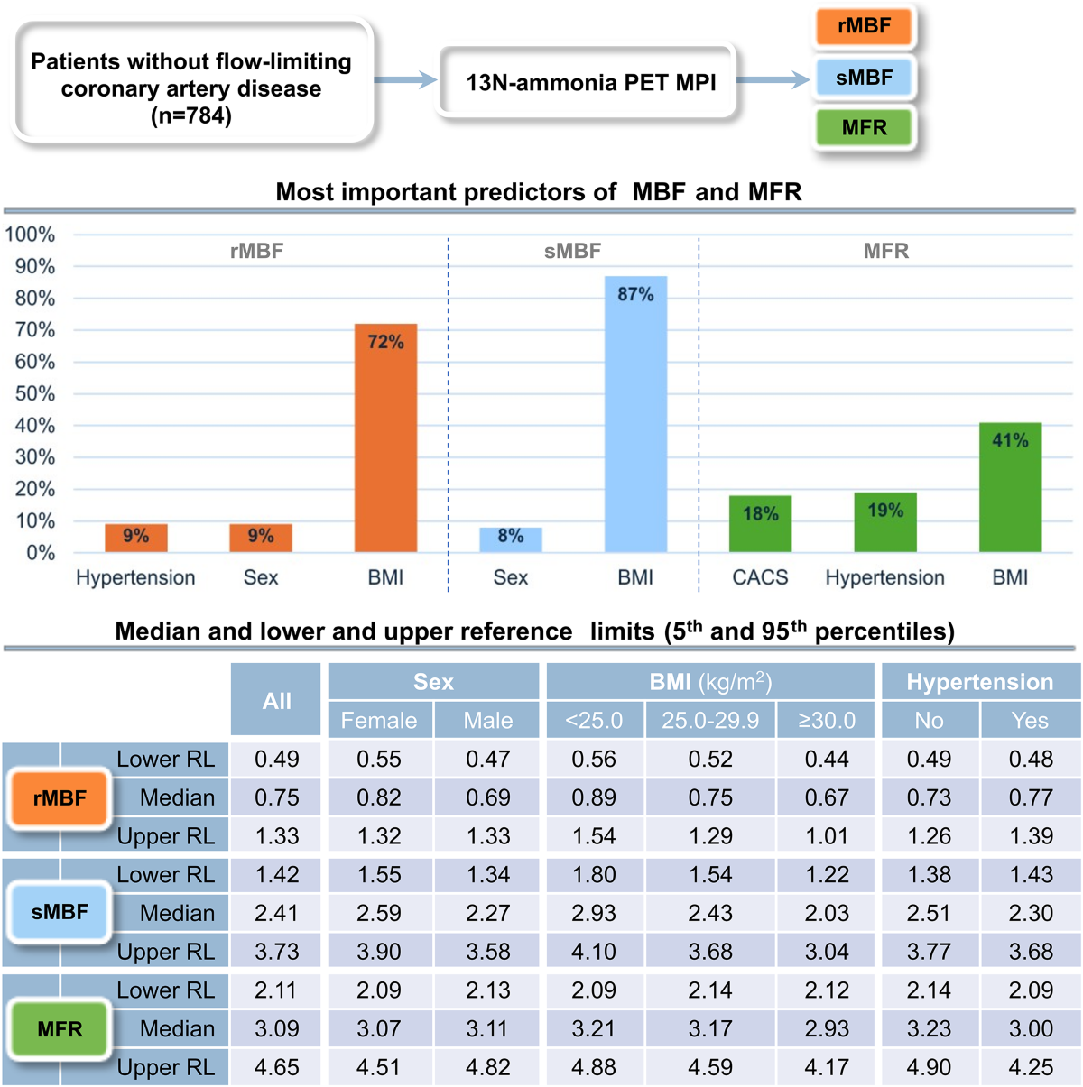 - 確認 body mass index (BMI) 是 resting myocardial blood flow (rMBF)、stress MBF (sMBF) 和 myocardial flow reserve (MFR) 最重要的預測因子。